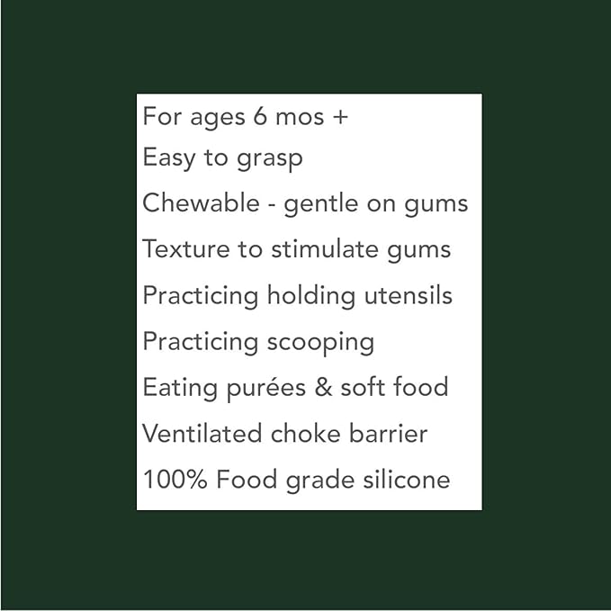 • DESIGN: ergonomically designed short flatter handle (unlike other silicone utensils on market) for better grip, the self feeding. It has ventilated choke barrier.