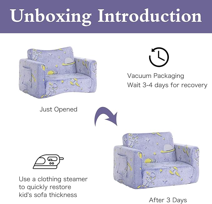 - Tips: When you receive the children's sofa, it may have wrinkles due to being compressed for shipping, but you can either wait 3-4 days for it to regain its original shape naturally or use a clothing steamer to quickly restore its thickness and remove creases.