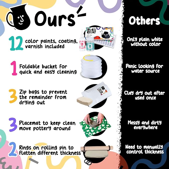 - ⚱️ALL-IN-ONE POTTERY SET | The air dry clay pottery kit for adults is designed with every tool, paint, varnish and more that you would need for your at-home pottery experience. From the 3.3lb of clay that's enough to make 4-6 potteries, distinct tools to 12 different color paints, it is a perfect clay making kit for beginners.