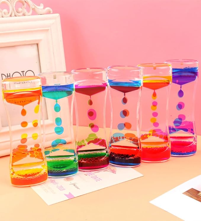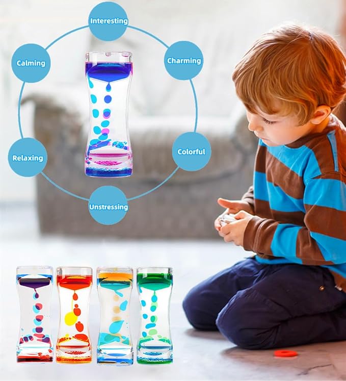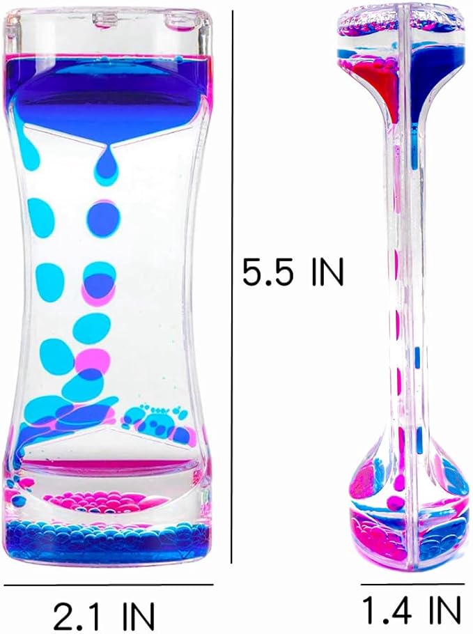 - Relaxation Stress Relief Toy : The oil and water sensory toy helps children and adults to focus, relieve anxiety and fight boredom. The oil drops create great visual effects as they fall, not only helping us to relax, but also providing visual fun. The Liquid Timer is especially good for people who work long hours in front of a computer, helping you relax while providing hours of entertainment