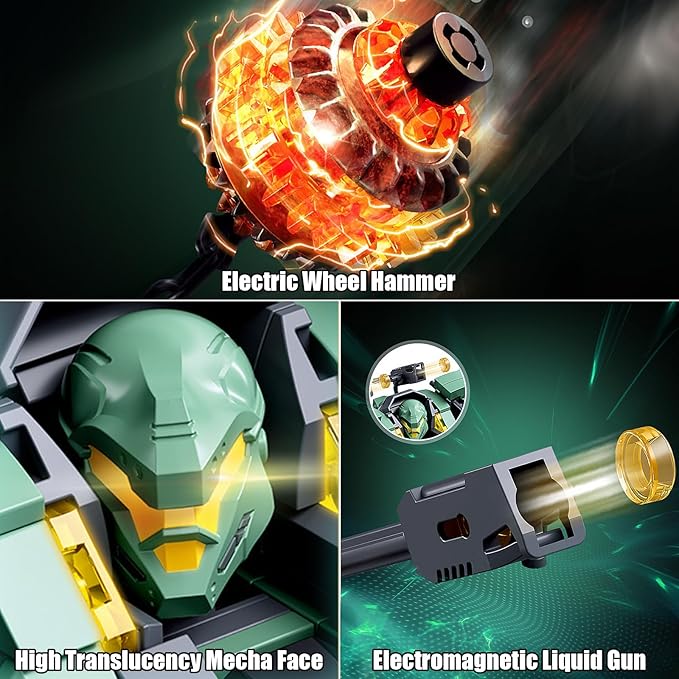 • Mech Building Kit: This mech model set has 542 pieces bricks.Let you get into the world of mechs with destroy warrior building kit, which inspired from a game.With electric wheel hammer,high translucency mech face and electromagnetic liquid gun,offering an good building experience.