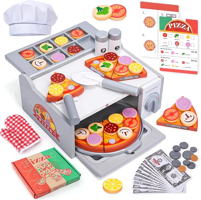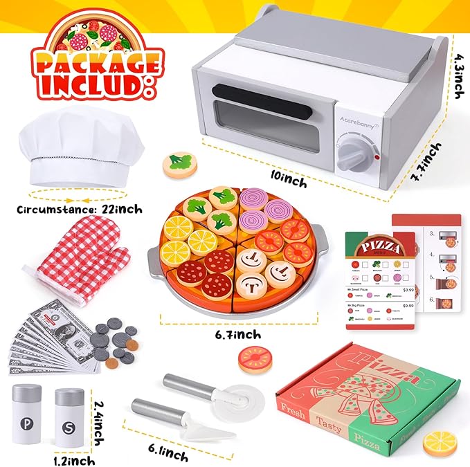 - 50 Pcs Wooden Pizza Counter Play Set: The highly realistic and durable Atoylink play kitchen accessories for toddlers include 1 oven counter with timing knob, 6 velcro pizza slices, 18 pizza toppings [6 ingredients (3 each)], 1 flat-bottomed plate, 1 pizza cutter, 1 spatula, 2 spices, 1 double-sided menu, 1 pizza box, 1 chef hat, 1 kitchen glove, 15 different game coins for pretend play. The endless creative mix-and-match fun makes endless fun