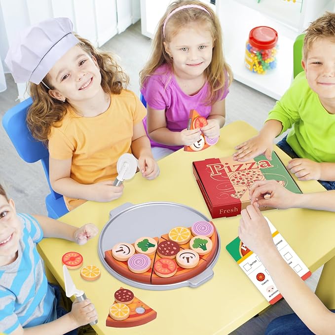 - Ideal Gifts for Kids: Wooden Pizza playset is multisensory pretend play food toy, a great kids toddler activities for 3 4 5 years old preschool, kindergarten, boys and girls. Making it a perfect gift for 3+ year old boy girl birthday, Christmas, Easter, New Year. Our products come with 90 days refund or exchange guarantee. Please feel free to contact us if you have any questions, we will solve them for you the first time