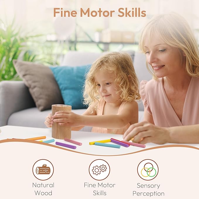 - Wooden Sensory Toys - The color classification and matching gameplay of wooden stick toys can help toddlers aged 1-3 improve their fine motor skills, cultivate children's color recognition and sensory abilities, and exercise their hand-eye coordination