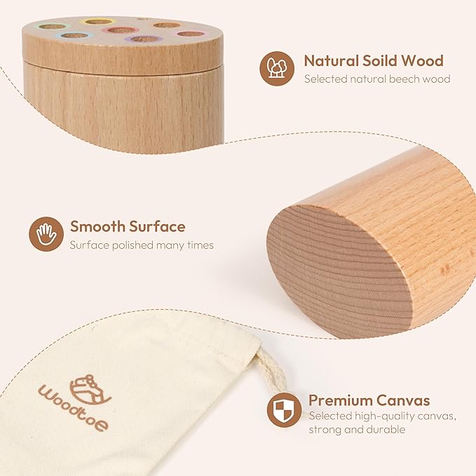 - Travel Size Design - The wooden box is designed in an oval shape, which is more suitable for children to grasp. The toy size and cotton cloth bag ensure it easy to carry, and kids can play whether at home, school, or outside travel at ease