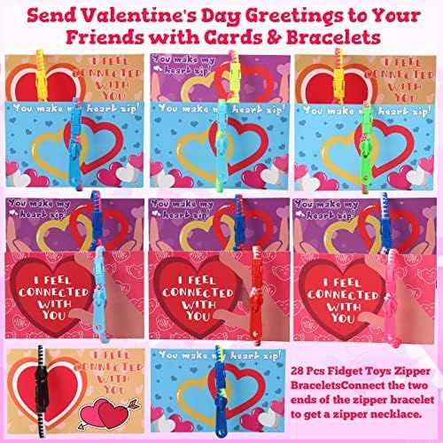 Wpond 28 Pcs Valentines Day Gifts, Kids Valentines Day Prefilled Valentine Cards with Zipper Bracelets, Zipper Bracelet Friendship Bracelet Party Sensory Bracelet Toys Favors for School Students
