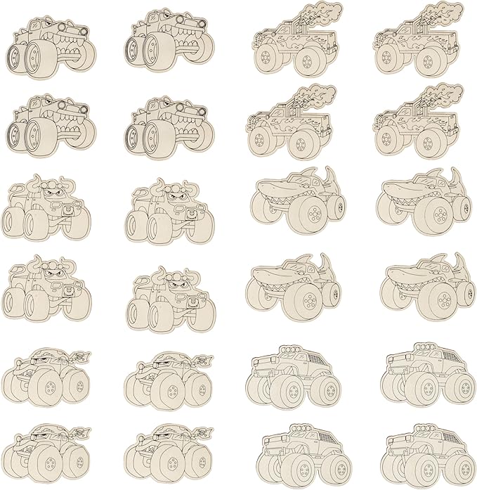 - Comes with 24 monster truck wooden paint kits, matching stickers, and adorable cards shaped as tires, flames, and checkered flags!