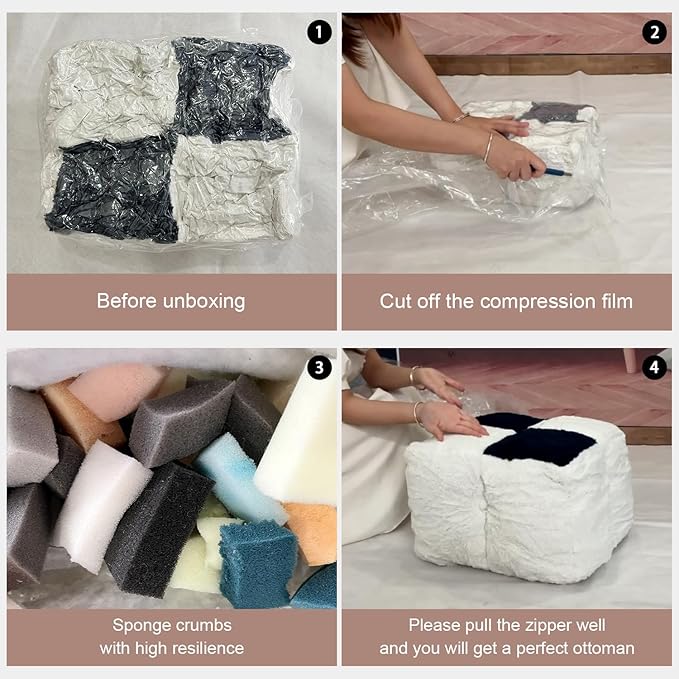 - Hassle-Free Setup: No installation required. Simply open the vacuum-sealed package and let the pouf expand naturally.