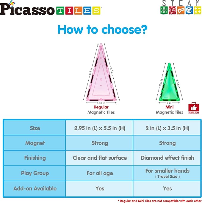 - DREAM BIG & BUILD BIG: The PicassoTiles' Mini Diamond Series is a fun and entertaining magnet building block toy set that allows for easy portability for travel and play. This playset includes 13 portable magnetic on-the-go pieces, (4 equilateral triangles, 6 isosceles triangles, and 3 squares) that have a diamond effect finish. Create amazing structures while having a blast wherever you go! Explore, get creative, and craft grand masterpieces!