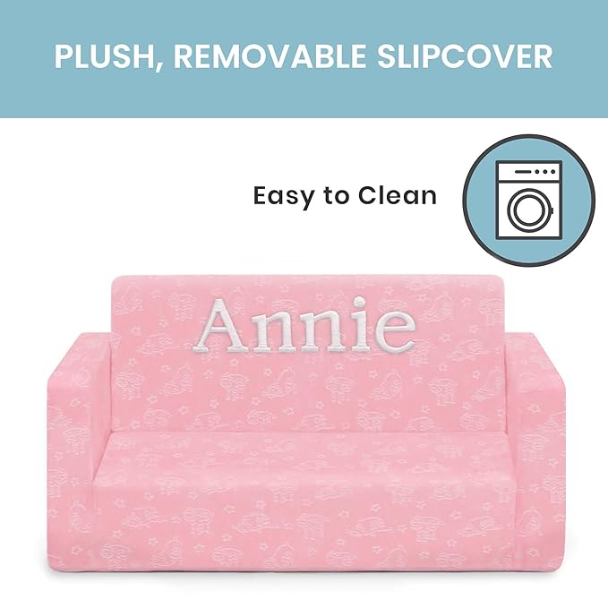 - PERSONALIZE YOUR SOFA: Personalization available in up to 9 characters and in multiple fonts | Your child’s name will be beautifully embroidered in the font and thread color of your choice – add to your cart to customize!