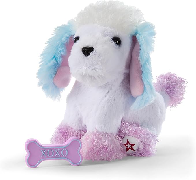 - A posable poodle with white fur and colorful accents—light-blue ears and poufy pink-and-purple paws and tail—plus a pink bow and a magnetic mouth to hold her dog bone toy