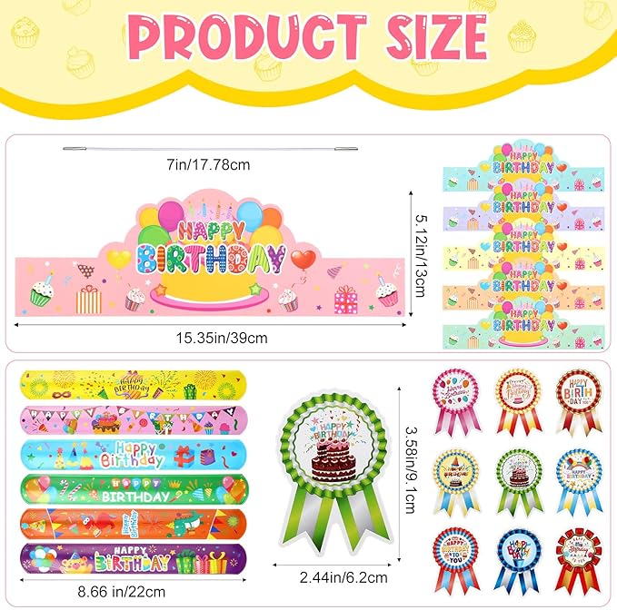 - Generous Bundle for Party Needs: our paper crowns bundle pack arranges for all your party requirement; This pack contains 36 birthday crowns, 36 birthday badge stickers, and 36 kids slap bracelets; The ample supplies in this package ensure you have more than enough goods to distribute to students at birthday classroom parties