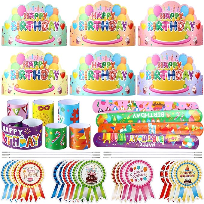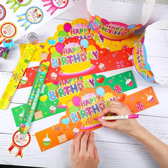 - Versatile Application: the paper birthday crowns for kids classroom, accompanied by the badge stickers and slap bracelets, make nice favors for celebrating a birthday across various gathering; Suitable for a home, classroom, camp, office, daycare, and church birthday parties