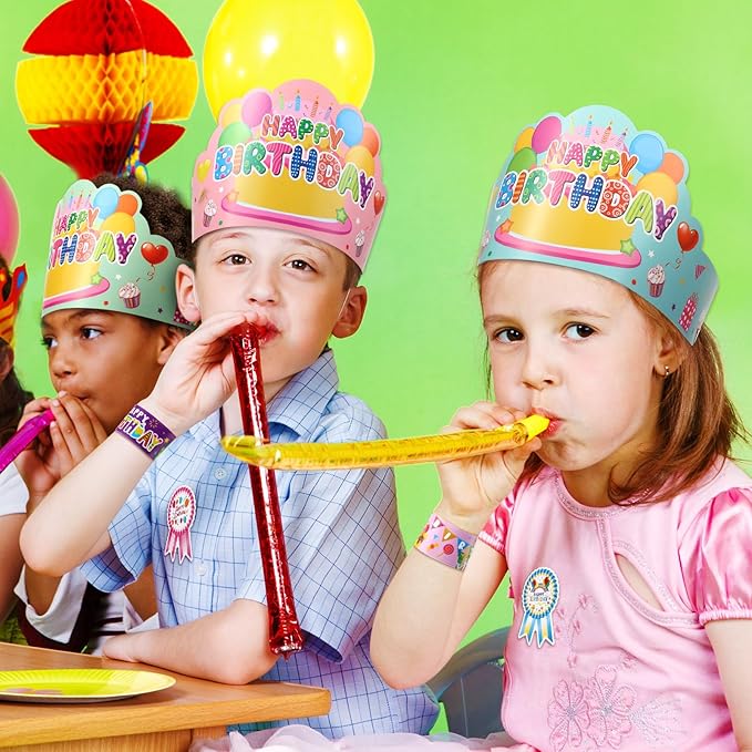 - Quality Material: crafting our products with quality is nice material; The happy birthday bracelets for kids classroom are crafted from reliable materials, ensuring they are soft and safe for both kids and adults to wear; The birthday hats are made of quality cardstock with delicate patterns; Additionally, the birthday stickers are made from PVC which conveniently sticks on clothes and removes with ease