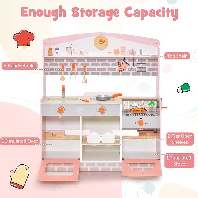 • 【Abundant Storage Areas】: The top shelf offers enough storage space for your condiments. And there are 3 hooks for kitchen utensils, 2 open shelves for small dishes or condiments and 1 simulated oven for baking game. Magnetic catch ensures effortless opening. This wooden toddler kitchen playset helps kids learn how to sort out their items.