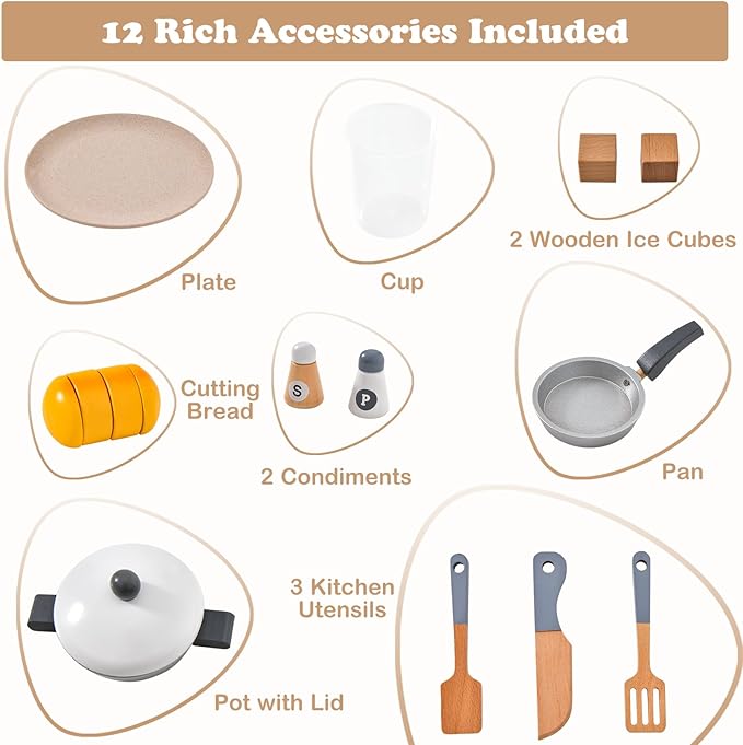 - 【Rich Accessories Included】 This kids kitchen playset is equipped with 1 pan, 1 pot with lid, 1 knife, 1 flat spatula, 1 slotted spatula, 1 cup, 1 plate, 2 ice cubes and 2 condiments, allowing kids to learn how to use different kitchen accessories. Additionally, this wooden kitchen for kids with a cutting bread for kids to slice the pieces apart to add more fun.