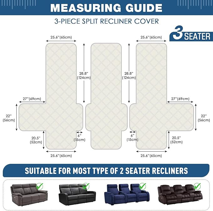 - 【3 SEATER RECLINING FIT】Our 3 seater sofa cover is designed to fit 3 seater reclining sofas, made with 3 seperate pieces , perfectly fit 76.8 inch reclining 3 seater couches. For more details, please refer to the measurement guide in the photo, please measure before purchase