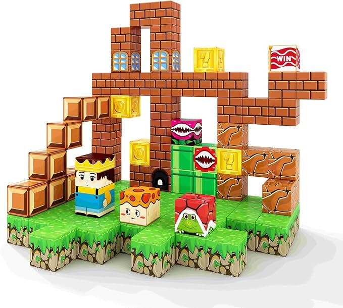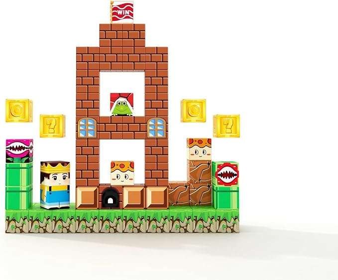 - BUILDABLE GAME ELEMENTS: The kids' toys set will drive Game fans crazy! The building toy includes various elements, stone, gold coins, random blocks, figures, mushrooms, windows and doors, man-eating flowers, turtles, etc. We can create our own level-breaking game. The magnetic toy can be stacked on the desktop or built on a garage door, refrigerator door, or anything iron. Let's design a level-breaking match together