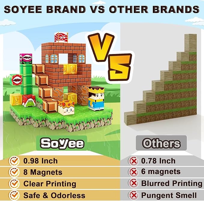 - QUALITY YOU CAN TRUST: SOYEE magnetic blocks think more from the kid's perspective and can give kids a clear definition of design. Unlike other magnetic toy sets on the market, they will mislead kids and interfere with their imagination of the product. Soyee magnetic blocks have more educational value and can restore kids' definition of the world