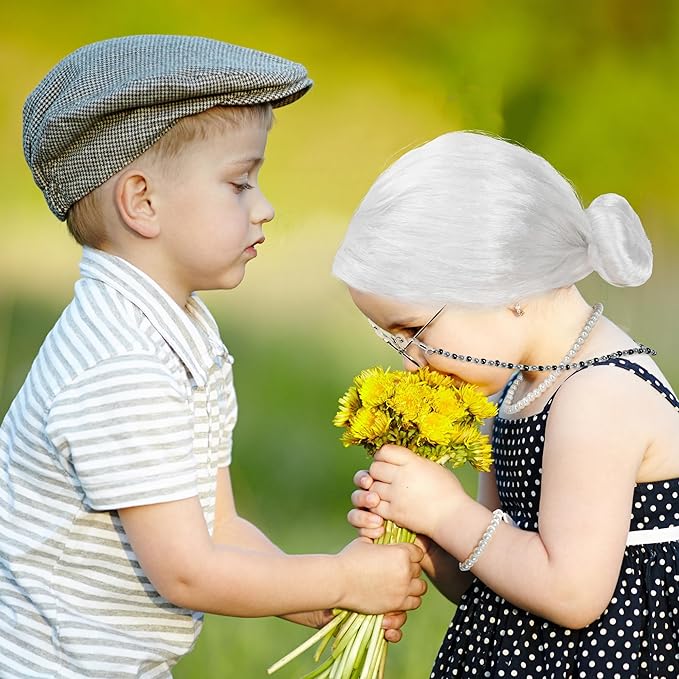 - What's Included - Included in this kids old lady costume cosplay wig set are 1 white bun wig, a set of granny glasses with a chain, a pearl necklace, a pearl bracelet, and a wig cap. It is designed to enhance your adorable old lady cosplay.