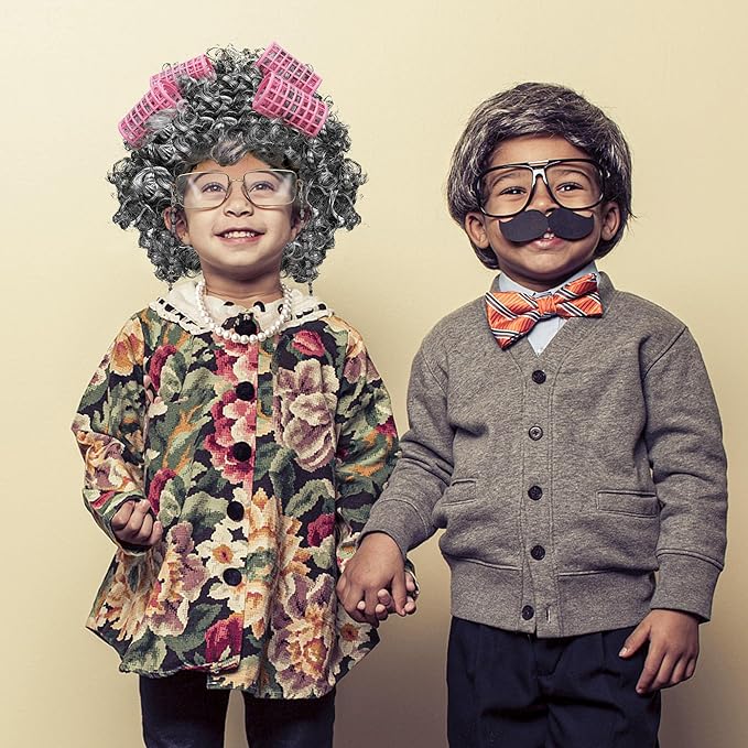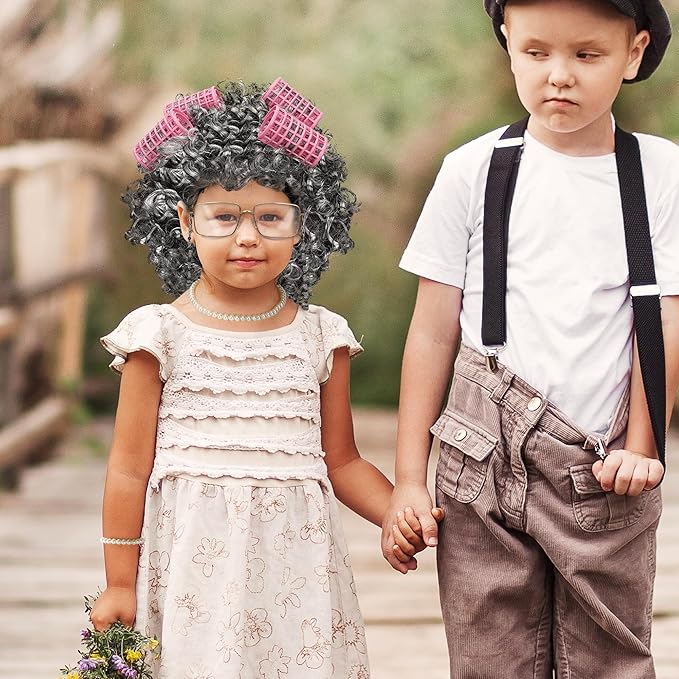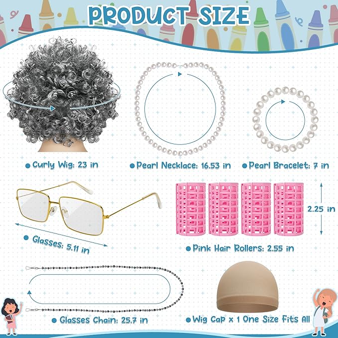 - Suitable Size - Dress up as an old lady with our kids' cosplay props. The curly wig measures 23 inches, the wig cap is elastic, making it suitable for all kids. With a 16.53-inch pearl necklace, a 7-inch pearl bracelet, 5.11-inch grandma glasses, a 25.7-inch glasses chain, and 4 pieces 2.55-in hair rollers.