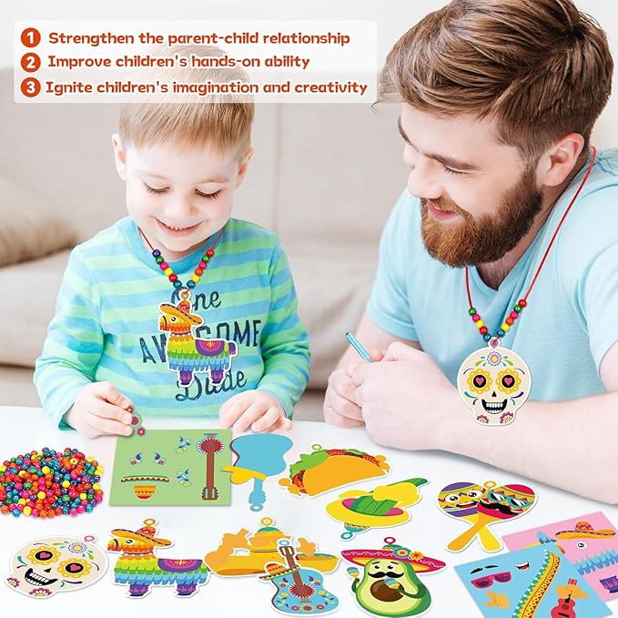 - 【Unique Necklace Design】Our Mexican fiesta arts&craft kits come with long strings and multiple colorful beads, so kids could make them into necklace and bracelet to wear, and cinco de mayo decorations to hang in kids room. Kids will have fun making these fun Mexican fiesta ornament crafts that can then be hung up to display their Mexican fiesta necklaces crafts set.