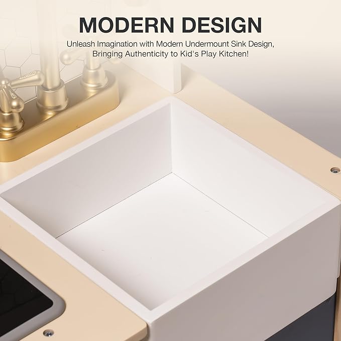 • Focuses on Kids’ Safety: Our kitchen playset is constructed using high-quality wood and MDF, built to withstand the rough and tumble of kids' play. All components are designed with kids and toddlers in mind, ensuring a user-friendly and safe experience.