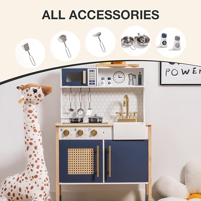• Built to Last: Crafted from solid wood, our Kids Pretend Play Kitchen Playset ensures durability and sturdiness. The unique vintage rattan design adds a touch of style. Follow the hassle-free assembly instructions, and rest assured it won't fall apart.