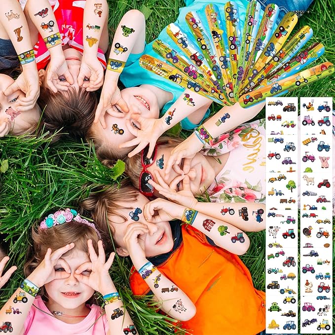 - Tractor Party Favors: Get tractor party supplies you need for a fun-filled tractor-themed party for kids, including 12 wristbands, 12 slap bracelets, 12 button pins, 12 tattoos stickers, 12 make stickers, 48 tractor shape stickers and 12 gift bags