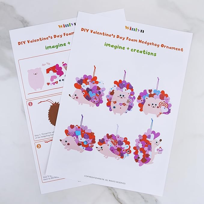 • 24 Sets Valentine's Day Ornaments Decorations DIY Valentine Hedgehog Craft Kits, including 24 pcs hedgehog shaped foam cutout bases in brown, 32 pcs die-cut Valentine hedgehog body parts foam stickers in blush, 462 pcs heart cutouts foam stickers in 9 Valentine colors, 40 pcs Valentine prints foam stickers, 24 pcs googly eyes stickers, 24 pcs satin cords, 2 sheet of artificial rhinestone stickers, 1 pc step-by-step instructions, 24 pcs treat bags, 24 pcs gift stickers, 24 pcs twist tie.
