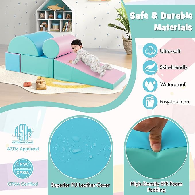 - 【Easy to Clean and Maintain】: The 5-piece climb and crawl playset is covered with a waterproof and easy-to-clean PU leather, making it simple to wipe away spills or dirt. The covers are also removable and machine washable, ensuring a hygienic and fresh play surface for kids.