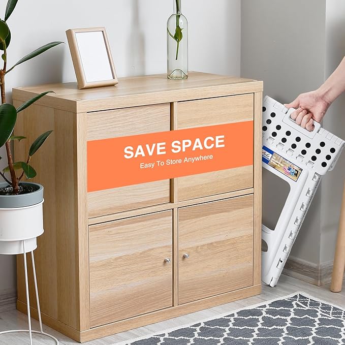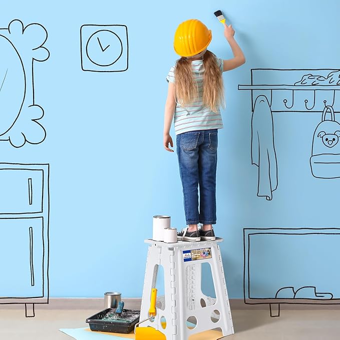 - 【Keeps You Safe】Anti-slip black rubber strap on each foot and special rubber dots on the surface to prevent slippage.Besides, our foldable stool is designed with rounded corners to prevent children and the elderly from being injured by collision.This safety features making the kitchen step stool great for kitchen, bathroom, dining room, office, garden, camping, fishing and more.