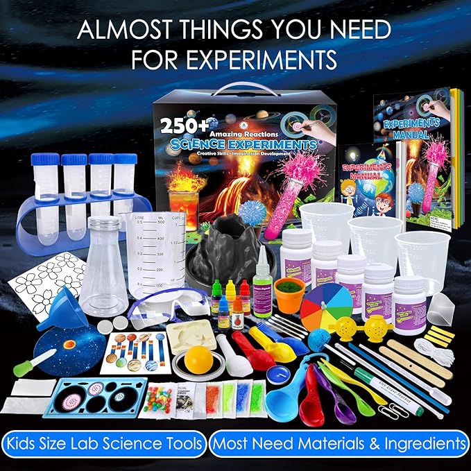 - 250+ MIND BLOWING EXPERIMENTS: Exciting and interesting activities including. create your own lava lamp, creative snow and volcano science kit the favorite of every child.Cause some awesome chemical reactions.Earth, surface tension, physics and more.