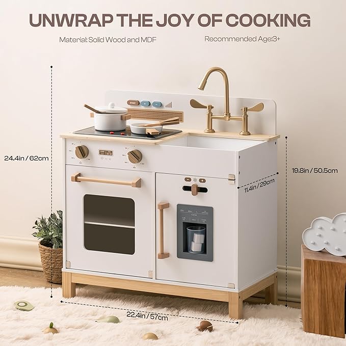 - Functional-Play-Kitchen: Elevate playtime with our Montessori-inspired Wooden Play Kitchen! Chic white design, wooden handles, and a shiny metal faucet transport your child to a world of creativity. The stove, with lights and sounds, brings cooking joy to life. Plus, an integrated ice maker adds a cool touch for endless imaginative play!