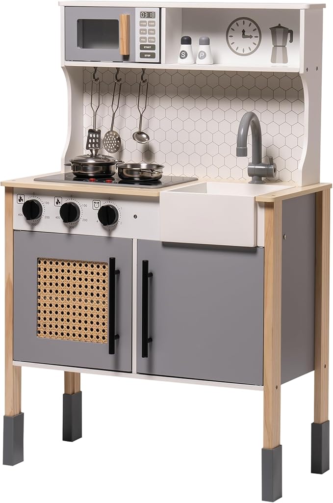 - Built to Last: Crafted from solid wood, our Kids Pretend Play Kitchen Playset ensures durability and sturdiness. The unique vintage rattan design adds a touch of style. Follow the hassle-free assembly instructions, and rest assured it won't fall apart.