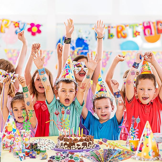 - Go Monster Party - Each accessory is full of monster style features, the monster style straw is removable, easy to use and reusable. The slap bracelet is also a small gift which is loved by children, and its quality is guaranteed. The stickers are also monster style and can be placed on anything you want to decorate. Keychains and tattoo stickers are also popular among children, giving them as gifts will definitely make them have an unforgettable party memory.
