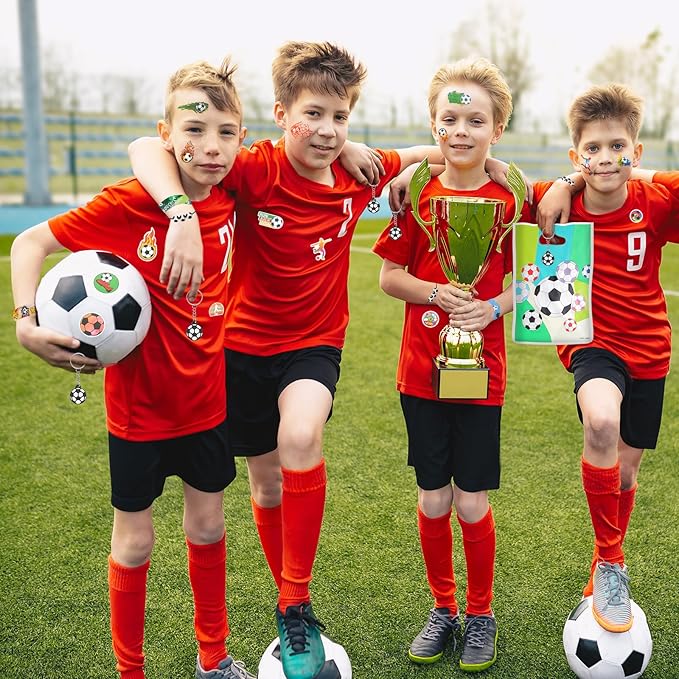 - Soccer party favors set: there are a total of 295 pieces of soccer party supplies, including 24 sheets of soccer temporary tattoos, 24 mini soccers, 24 soccer slap bracelets, 24 soccer keychains, 25 soccer gift bags, 24 soccer bracelet and 150 football stickers, different items with adequate quantity to satisfy your diverse and football party using, decorating and sharing needs