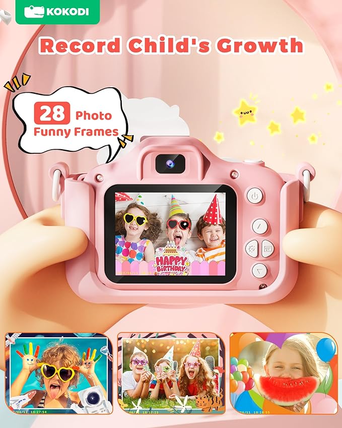 - đď¸ăMulti-functional Camera Toy for Kidsă: KOKODI selfie camera has 28 cartoon sticker photo frames, 6 filters and 3 puzzle games. The unicorn toy is also equipped with functions such as selfie, video, music player, recording, and timed shooting, meet kid's various needs. Moreover, you can download the photos and videos to a computer using the included Micro-USB Cord, helping kids to cherish the children's happy memories with their family.