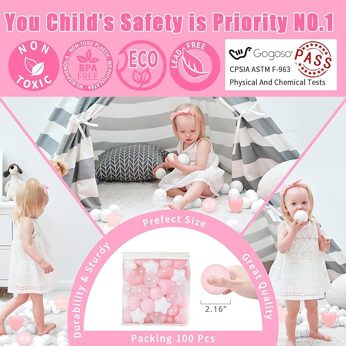 - Premium Quality: Our GOGOSO ball pits balls 100pcs stars and hearts are made made of phthalate-free, BPA-free, and non-toxic materials thicker and more durable materials, each ball capable of withstanding over 140 pounds of weight. Enjoy worry-free playtime!ensuring long-lasting fun for your kids play.