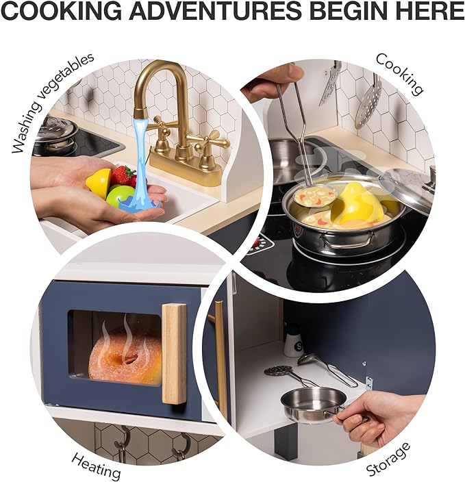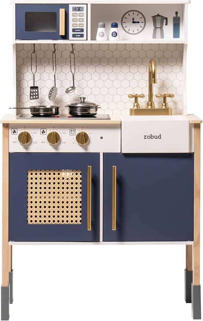 - TIMELESS RETRO ELEGANCE: Immerse your child in a world of vintage charm with the ROBUD play kitchen. Its American retro design, highlighted by a gleaming golden faucet and striking sapphire blue accents, makes it a standout piece in any playroom. It's more than just a toy—it's a stylish statement.