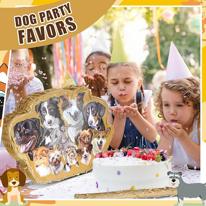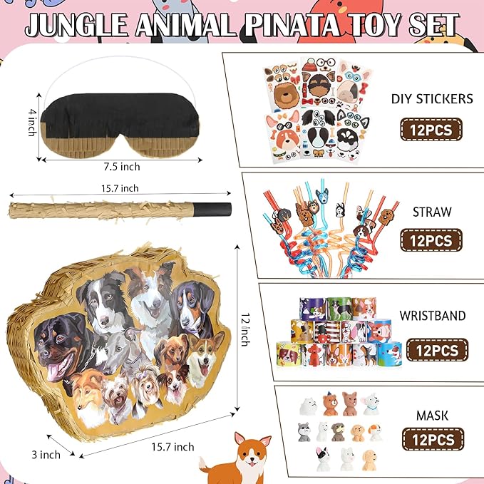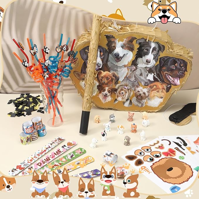 - Comprehensive Party Set: the dog party decorations provide most items needed for a fun and exciting dog themed party, which includes piñata, piñata stick, blindfold mask, confetti, slap bracelets, dog figures, dog sticker sheet, and straws; This comprehensive package removes the need for multiple purchases, saving time and creating a cohesive party theme
