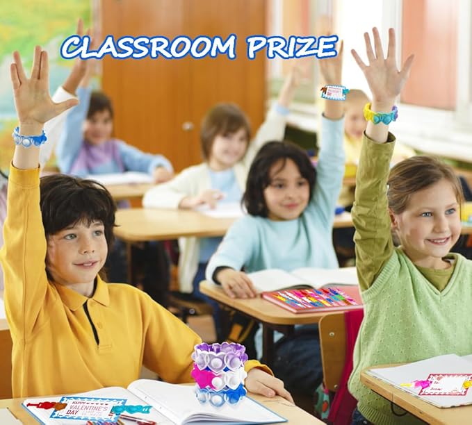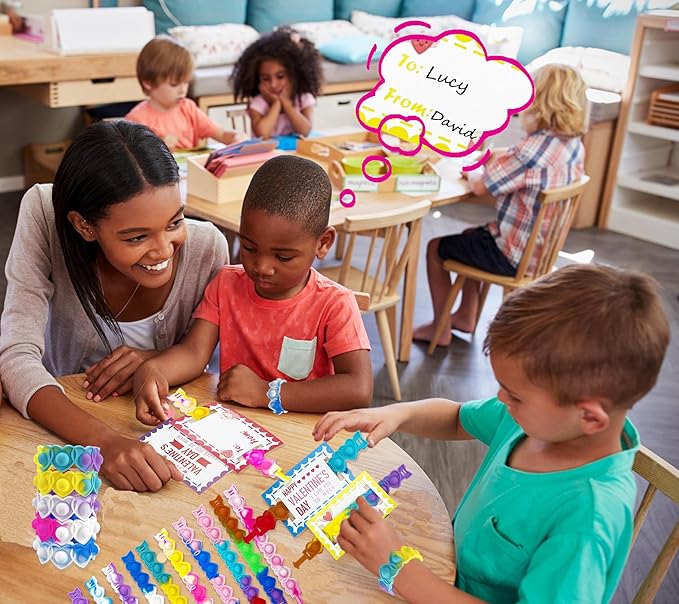 - [Unique Design for Valentines Day]: 40pcs heart shape pop bracelets and 40pcs custom Valentines Day cards for kids.
