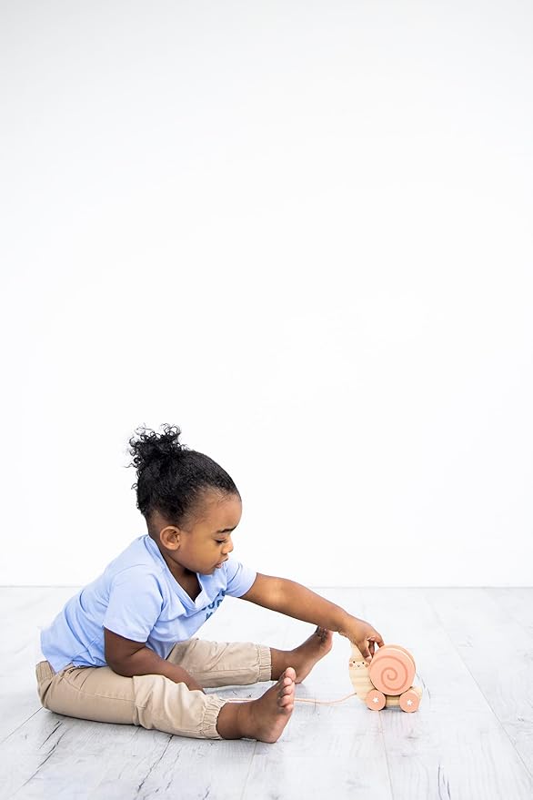 - Classic Character Design: This learning toy features 4 wheels and an attached easy to grasp long string to push and pull the friendly snail throughout your home. The detachable round snail shell contains colorful wooden balls that softly rattle around while your busy toddler moves.