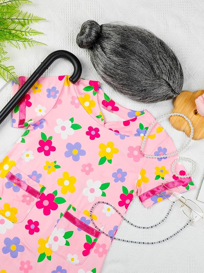 - What's Included - Our old lady costume for kids set includes 1pcs old lady dress, 1pcs black white bun wig, 1 set of old lady glasses with 1pcs chain, 1pcs pearl necklace, 1pcs pearl bracelet, 1pcs wig cap, and 1pcs kids cane prop. Great 100th day of school costume for girls cosplay.