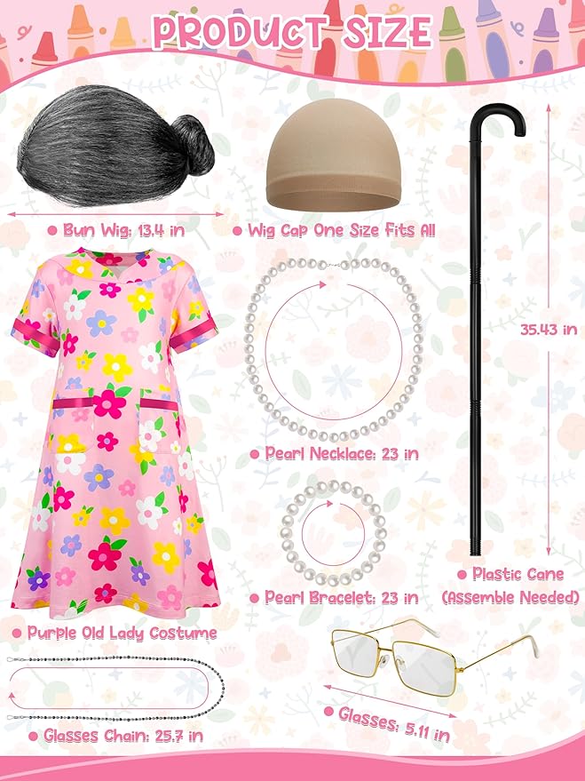 - Product Size - Our old lady outfit for kids with a range of sizes of M, L, XL, ensuring an comfortable fit for most girls. The old lady wig is 13.4 in, the wig cap is elastic, making it suitable for all kids. With a 16.53-inch pearl necklace, a 7-inch pearl bracelet, 5.11-inch grandma glasses, 25.7-inch glasses chain, and a 35.43-inch walking cane.