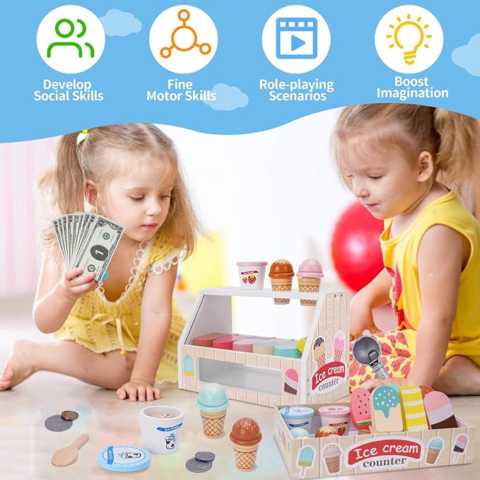 - 【All-in-one Ice Cream Counter Set】 The Wooden Scoop & Serve Ice Cream Counter includes a wooden ice cream counter, 6 flavors of ice cream cones, 6 kinds of colorful popsicles, 2 ice cream cups, 1 scooper, 2 wooden spoon, 10 pretend dollars, 10 coins, and a menu. All the accessories needed for an ice cream shop are included, so your child can start their 'business' whenever they want. Let your little one’s imagination soar!