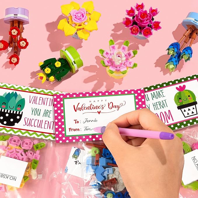 Valentines Day Gifts for Kids 8-12, 24 Pack Succulents Plants Building Blocks Kit With Gift Cards for Kids School Classroom, Class Valentines Gift Exchange, Kids Party Favors Stuffers Fillers