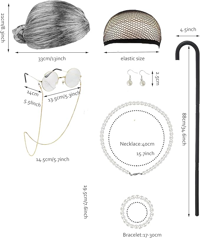 - 1:Package includes 6 pcs: 1 Wig with Curles and Wig Cap,1 Cotton Dress,1 Glasses with Chains Strap, 1 Cane,,1 Necklace.