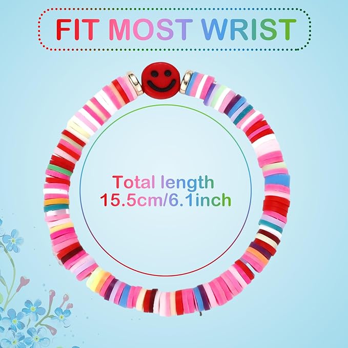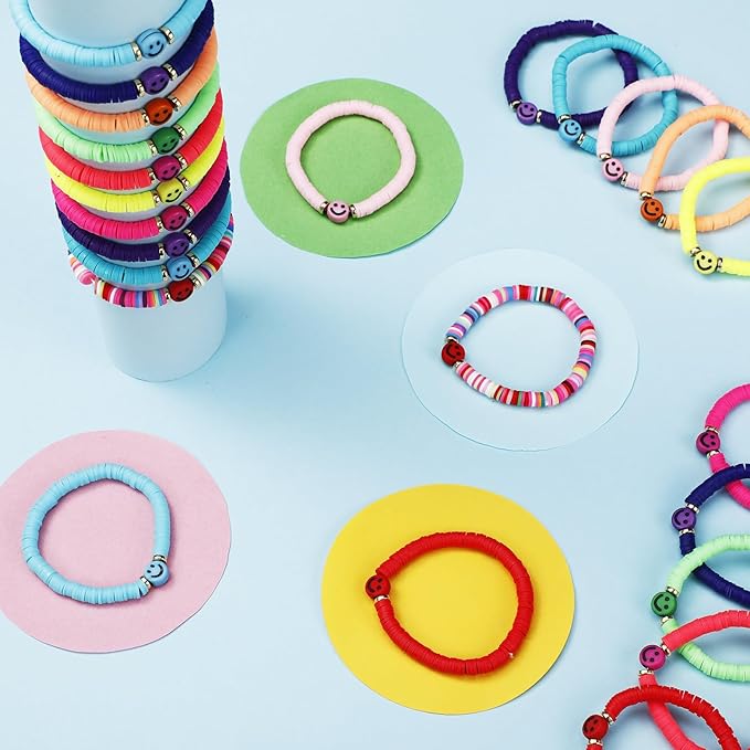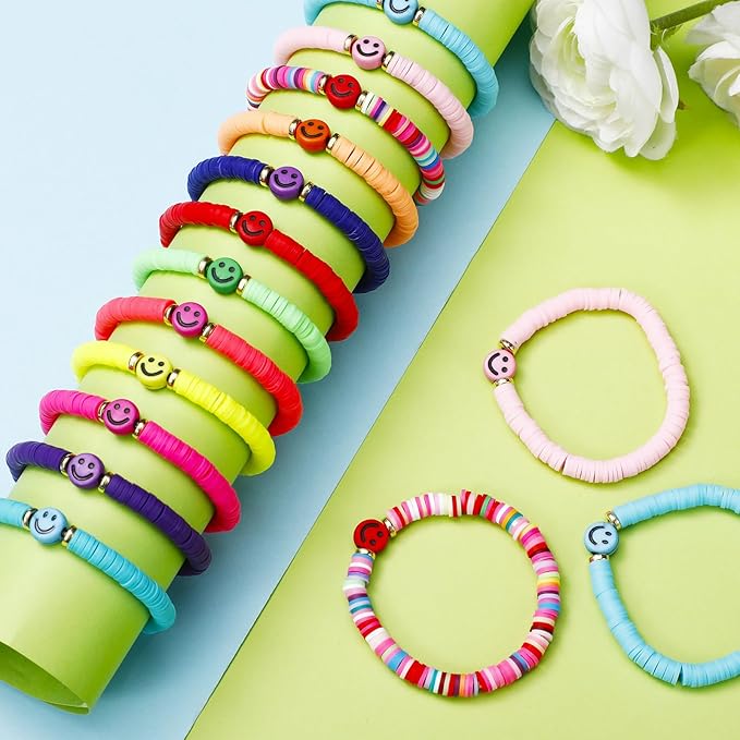 Sureio 24 Pcs Colorful Happy Smile Face Friendship Bracelets Preppy Bracelets Heishi Surfer Stretch Bracelets Beaded Bracelet for Women Party Favors