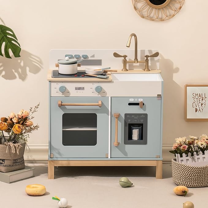 ROBOTIME Play Kitchen for Toddlers, Wooden Kids Play Kitchen Playset with Real Lights & Sounds/Ice Cube Dispenser, Pretend Play Montessori Toy Kitchen, Gift for Ages 3+ (Blue)